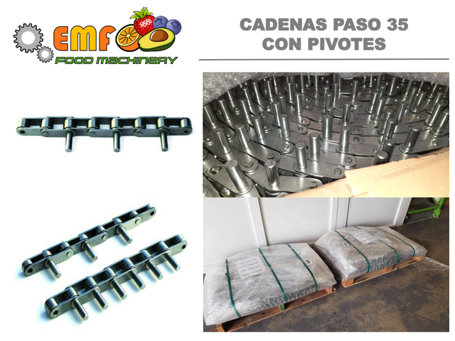 Cadena de rodillos de paso 35 con pivotes, destinada al sector agroalimentario y hortofrutícola.